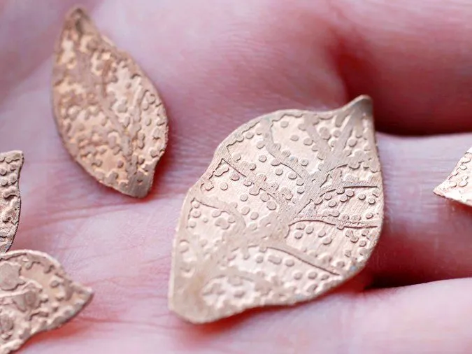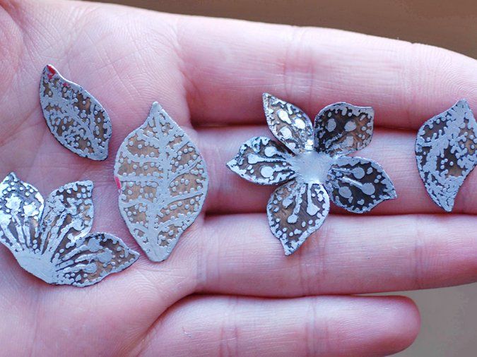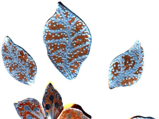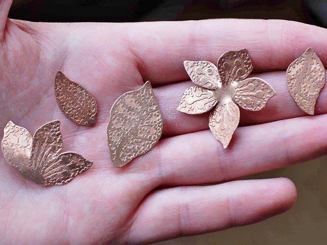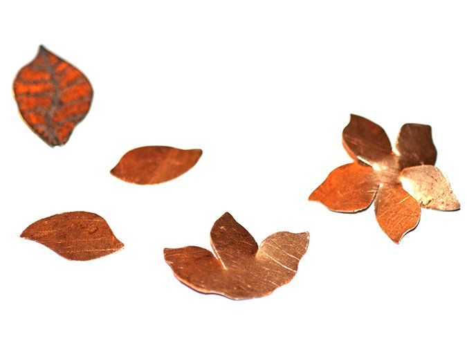 1. Из медного листа вырезаю ножницами заготовки: листики-цветочки; изгибы подпиливаю гравировальником (можно напильником или лобзиком пилить по контуру, но это занятие для терпеливых)