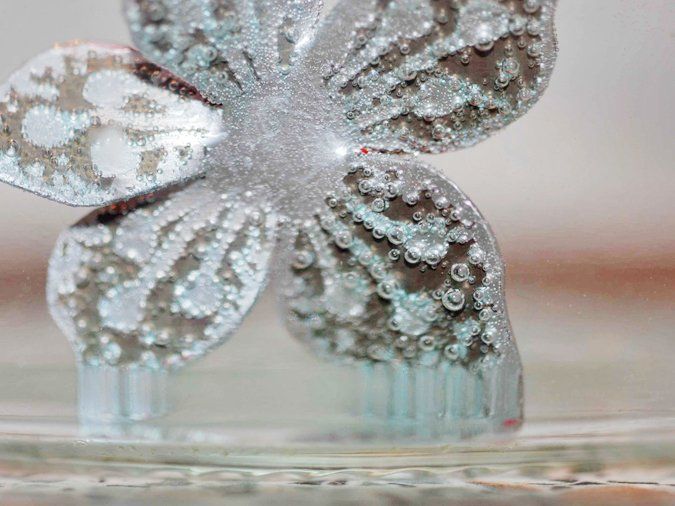 3. Жидкость для травления: в стеклянной баночке смешиваю перекись, лимонную кислоту и соль, заготовки кладу рисунком вниз. Самое начало — первые пузырьки