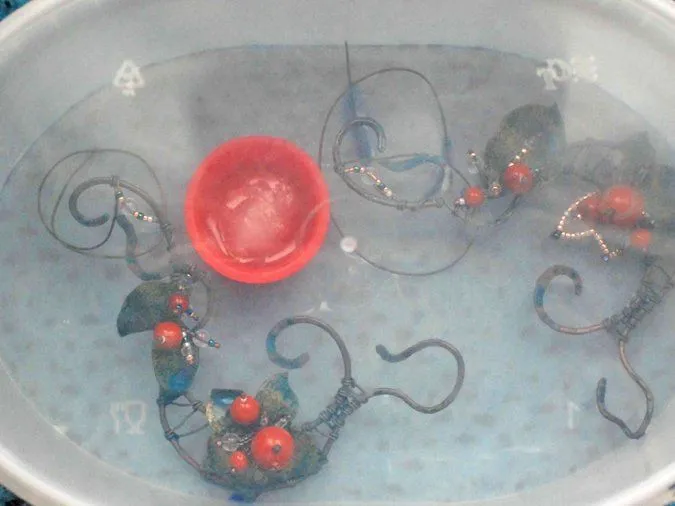 19. Изделие замачиваю в воде. В контейнер ставлю крышечку с ваткой (чтобы аммиак не высох); изделие кладу в контейнер, наливаю аммиак и оставляю на пару часов