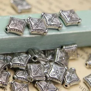 4. Звено с каплей присоединяем к бейлу, зажимаем до конца петлю. Далее нужно нанизать на пин с кольцом бейл, по бокам которого находятся рондели, плоские металлические, а затем круглые металлические бусины.