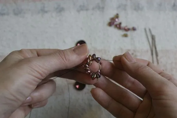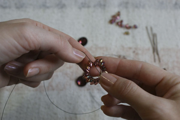 9. После последней бисеринки во втором ряду леску без бисера продеваем в первую бисеринку второго ряда. Третий ряд будет повторяться.