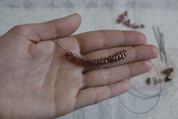 1. Отмеряем леску длиной около 80 см. Нанизываем 18 бисеринок Long Magatama.