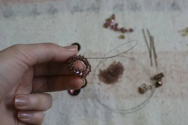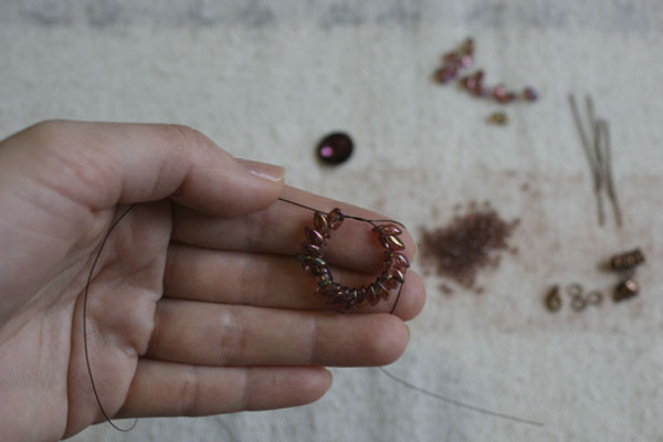 2. Бисеринки должны быть в одном направлении. Замыкаем их в круг и завязываем двойной узел, не сильно крепко.