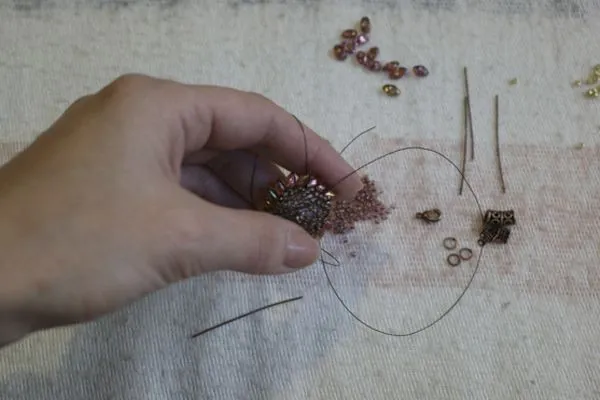 17. Оплетение закончили. Рабочую нить мы продеваем от середины плетения к краю нашего кабошону, к месту начала плетения в первом ряду.