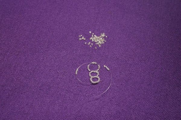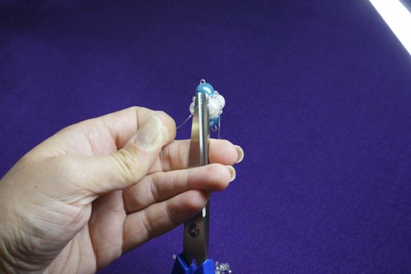 6. Пальцем прижимаем нанизанное к петельке, визуально отмеряем еще около сантиметра и отрезаем лишнее кусачками. Будьте внимательны, отрезанный кусочек может стрельнуть в сторону.