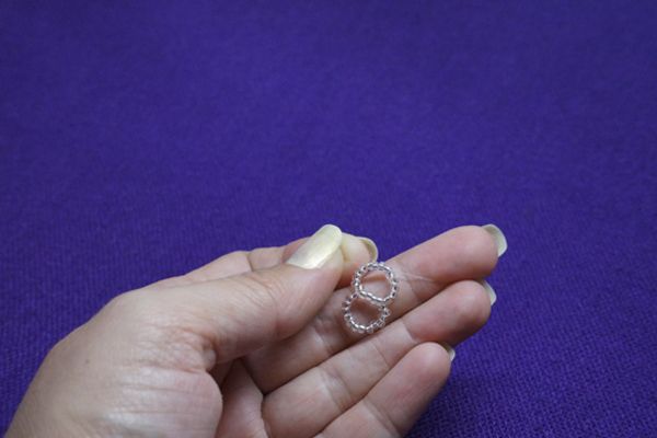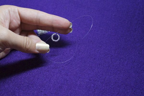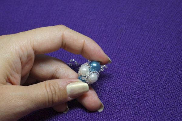 11. Нанизываем по 5 бисерин на каждый конец и следом такие же 4, в которые проходим обоими концами лески. Затягиваем.