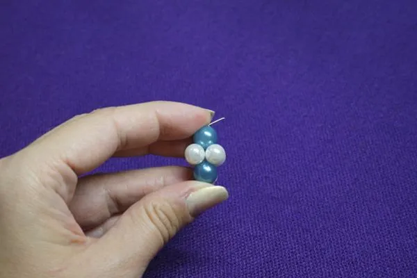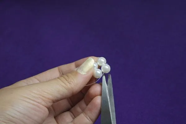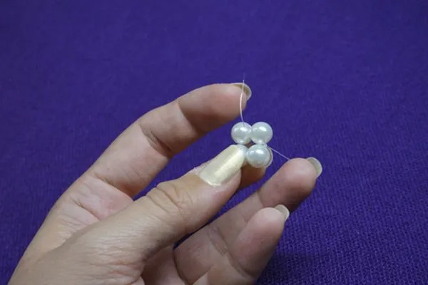 1. Отрезаем 10-15 см. лески. Нанизываем четыре маленькие бусинки, располагаем на середине.