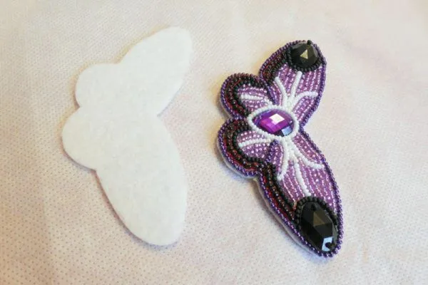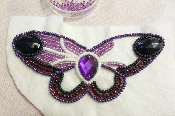 15. Пришиваем бабочку к спинке. Начинаем обрабатывать края вышивки бисером.