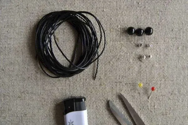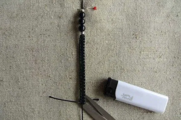13. Оформляем концы браслета: надеваем металлические бусины-шарики, обрезаем излишки нитей, оставив 5-6 см, подпаливаем концы.