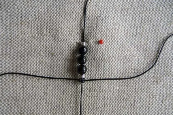 3. Берем основу браслета – нить 40 см, надеваем на нее 3 бусины из агата по центру и 2 металлические бусины с орнаментом по бокам. Помещаем все бусины на середину нити.