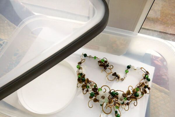 13. На дно контейнера ставим мисочку с аммиаком, рядом с ней кладем изделие, как на фото.