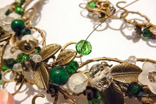 8. Теперь начинаем украшать изделие, прикручивая к основе обмоточной проволокой различные бусины, акриловые цветочки, металлические элементы и другой декор, который подскажет ваша фантазия