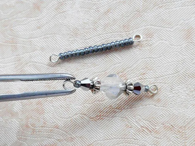 1. Собираем на пины два звена: большое - один большой биконус с двумя разделительными металлическим бусинами, двумя маленькими биконусами и двумя бисеринами; маленький - набираем столько бисера, чтобы длина этого звена равнялась длине большого.